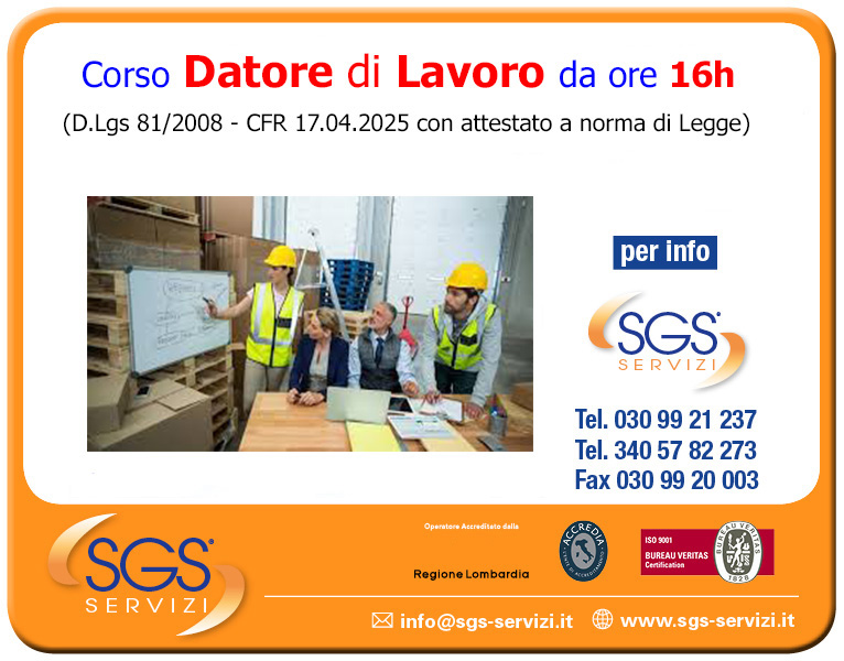 Corso per tutti i Datori di Lavoro da ore 16 (D. Lgs 81 del 09 aprile 2008 art.37 comma 7 e dell’Accordo del 17 aprile 2025 n.59/CSR sancito in Conferenza tra lo Stato le Regioni e le Province Autonome di Trento e Bolzano e valido su tutto il territorio nazionale).