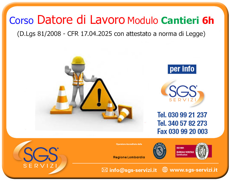Corso per Datori di Lavoro Modulo aggiuntivo "Cantieri" da ore 6 (D. Lgs 81 del 09 aprile 2008 art.37 comma 7 e dell’Accordo del 17 aprile 2025 n.59/CSR sancito in Conferenza tra lo Stato le Regioni e le Province Autonome di Trento e Bolzano e valido su tutto il territorio nazionale).